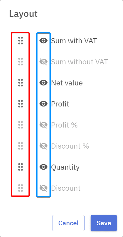 A window will pop up where the layout can be set. Eye icon (blue) is to set the visibility of the column, and dots (red) are to edit the order of the columns by dragging them. Pressing “Save” will save and apply the set layout.