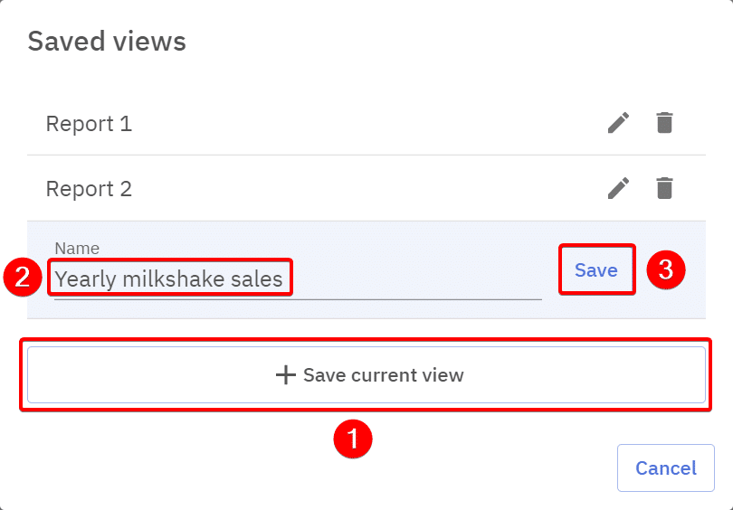 Report configurations can be saved by clicking on the “Saved views” button, so it’d be easy to load them later on.