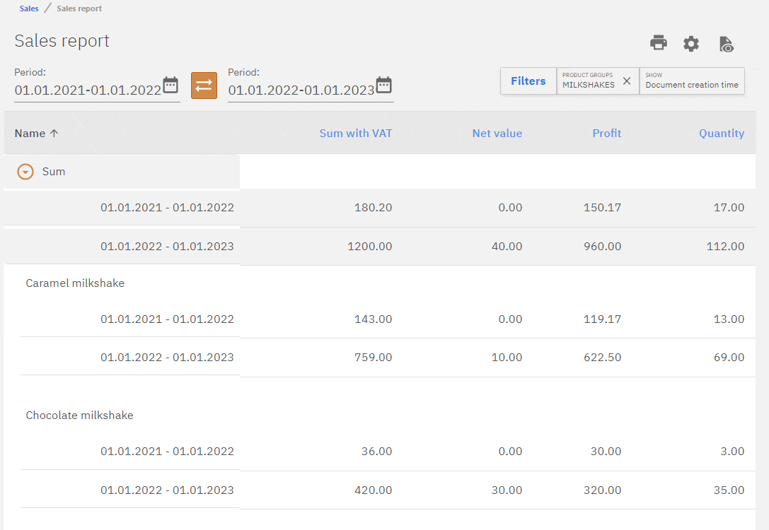 An extra period window will appear which is for the comparative period. The example is set to compare the current year and last year sales of Milkshakes.