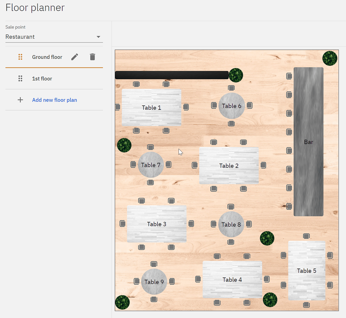 Tables are sale point specific and can be managed under SettingsFloor plans and Table numbers.