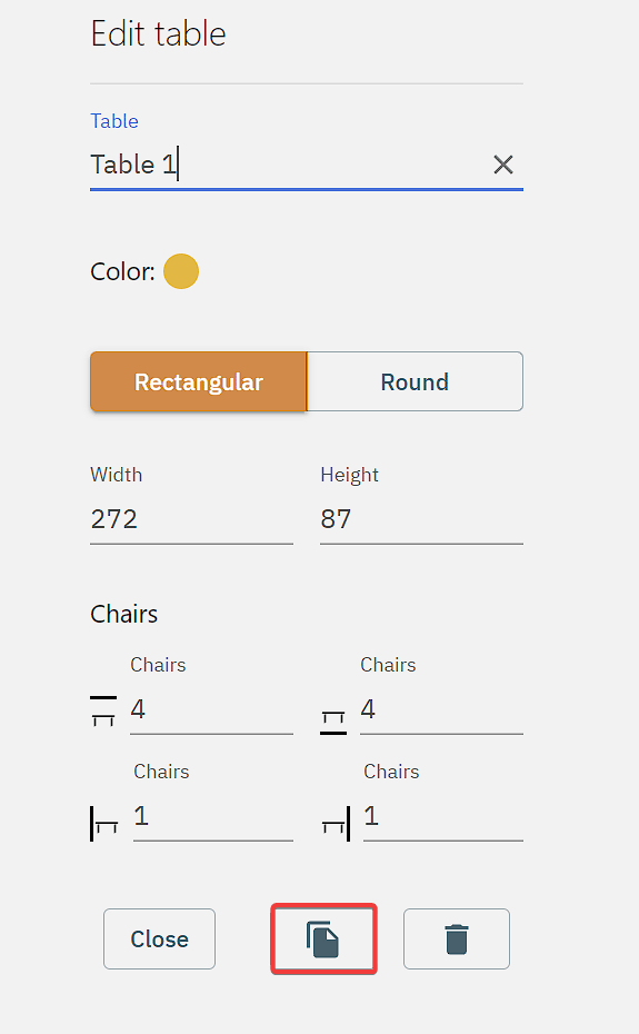 A copy of a table will have the same table number as the original and by clicking on the copy, the table name can be changed from the right side menu.