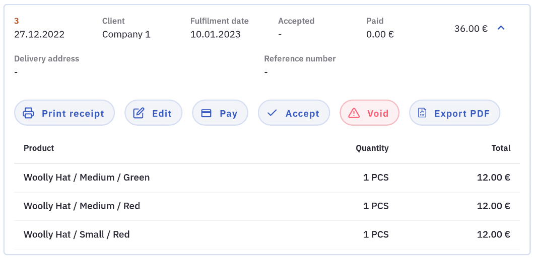 - Edit – allows to edit the contents of the order (option is only visible when the order is not accepted)
