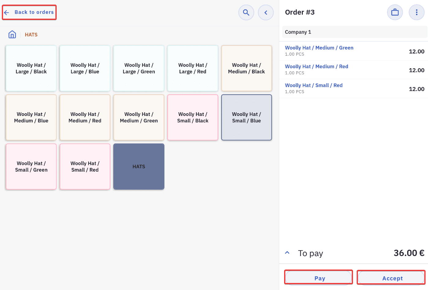 - Pay – button to add payments to the order (option is only visible when the order is not accepted)