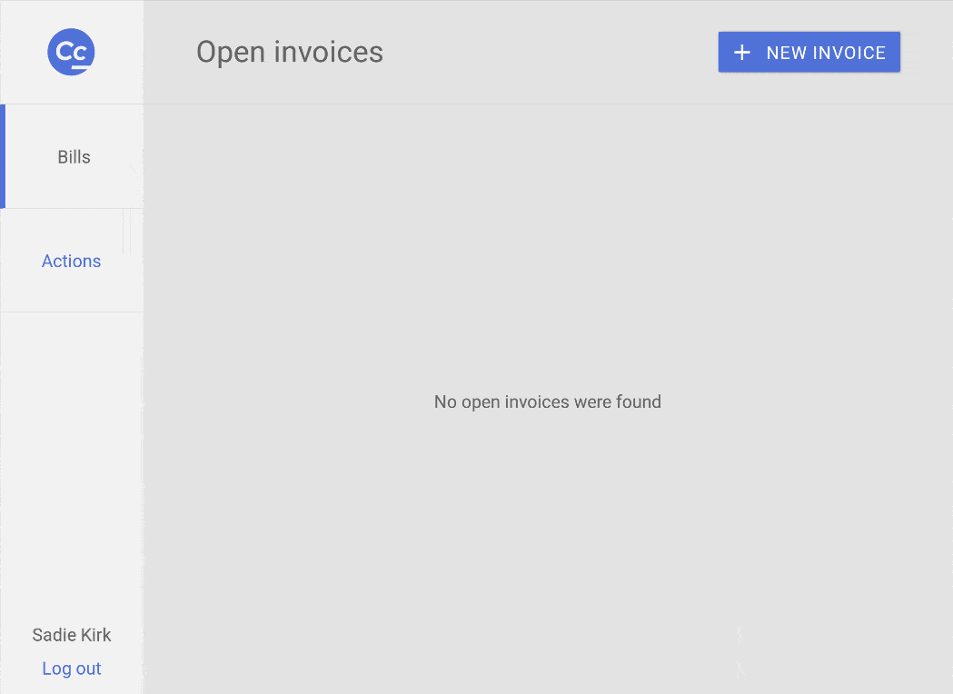 New invoice can be opened in the Bills menu, by clicking + NEW INVOICE. Products to the invoice can be added by using buttons or product search.