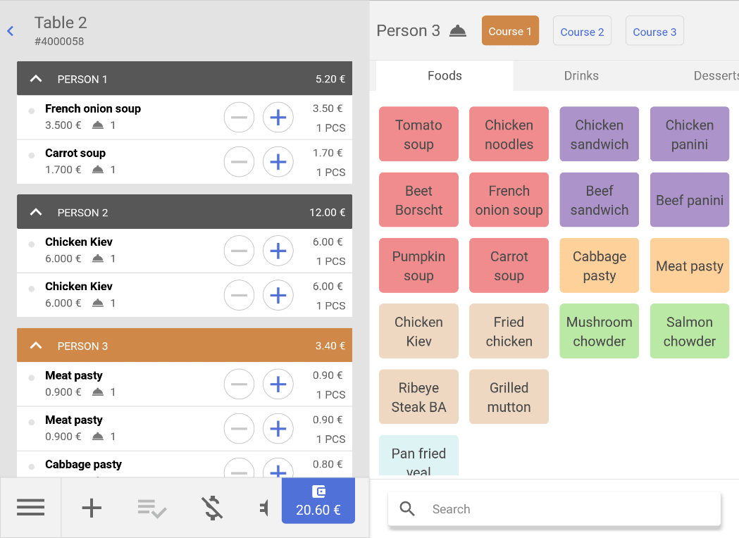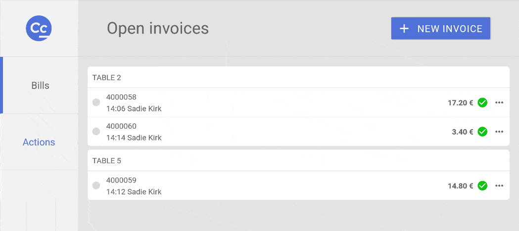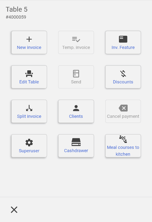 When the an integrated terminal isn’t connected the waiter has to enter the sum of the invoice to the bank card terminal, after the the payment has been successfully received the Card payment button can be clicked to close the invoice.