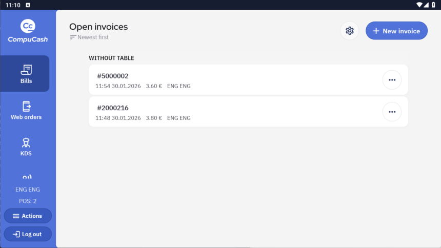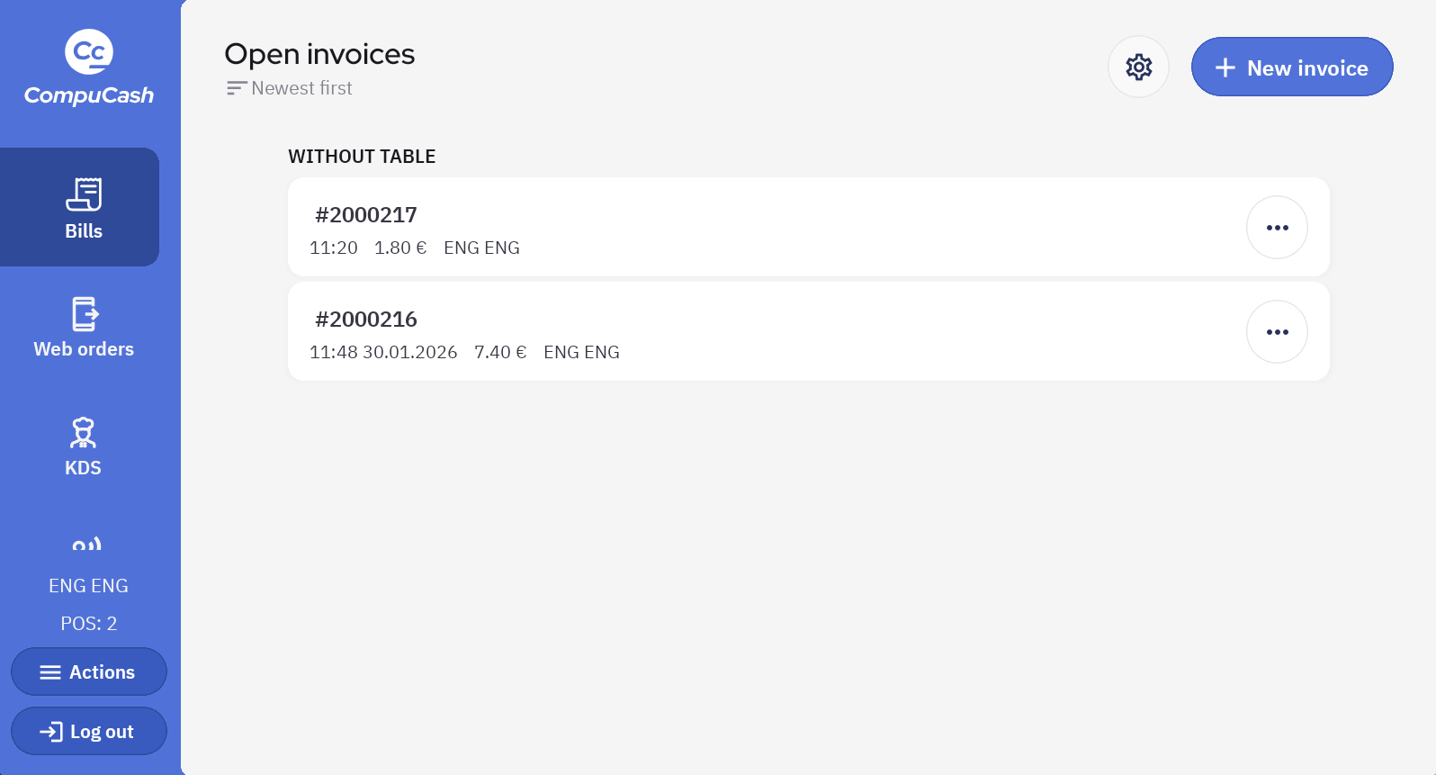 New invoice can be opened in the Bills menu, by clicking + New invoice. Products to the invoice can be added by using buttons or product search.