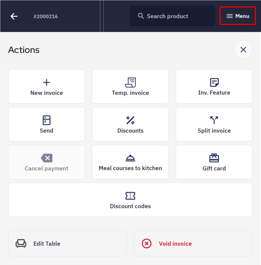 New invoice – Opens up a new invoice, if the already existing invoice has any products, it will be sent to open invoices list under Bills. This will also send orders for the existing invoice to kitchen if not sent already.
