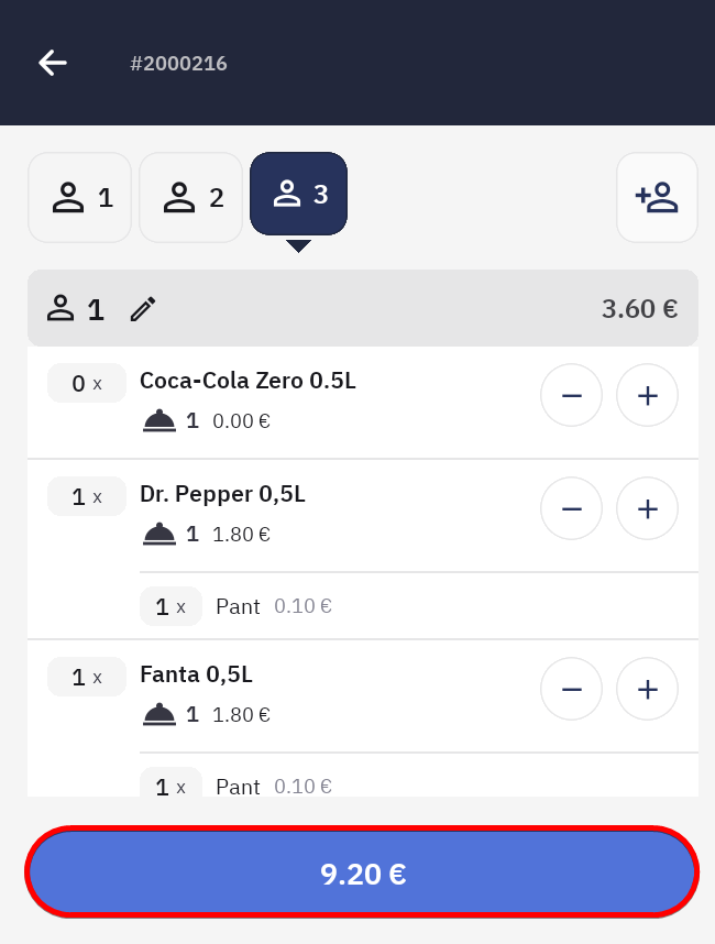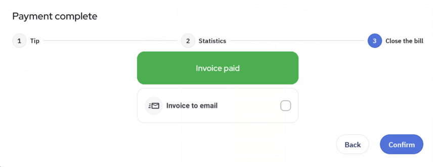 When the an integrated terminal isn’t connected the waiter has to enter the sum of the invoice to the bank card terminal, after the the payment has been successfully received the Card payment button can be clicked to close the invoice.