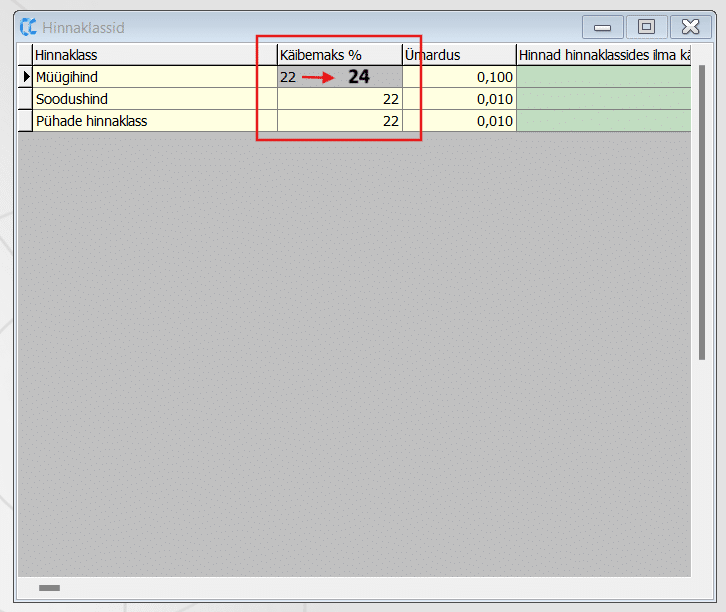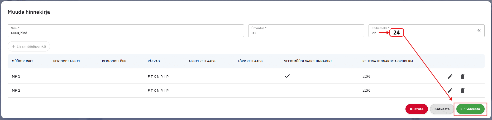 Senise 22% asemele tuleb Käibemaks * lahtrisse märkida 24% ning seejärel muudatused salvestada.