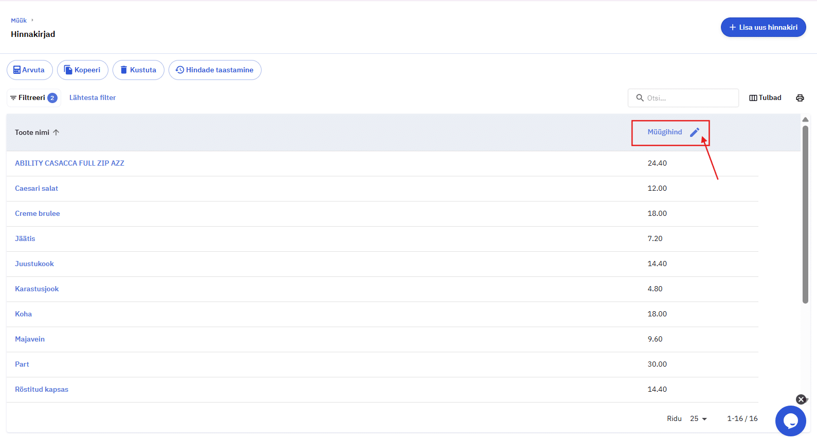 Compucash5 veebikontoris saab käibemaksu muuta minnes MüükHinnakirjad ja valides hinnakirja, mille käibemaksumäära muuta soovite.