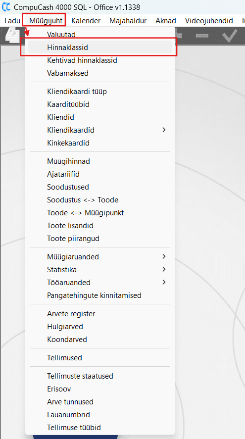 Compucash 4000 kontoris saab käibemaksu standardmäära muuta minnes MüügijuhtHinnaklassid,