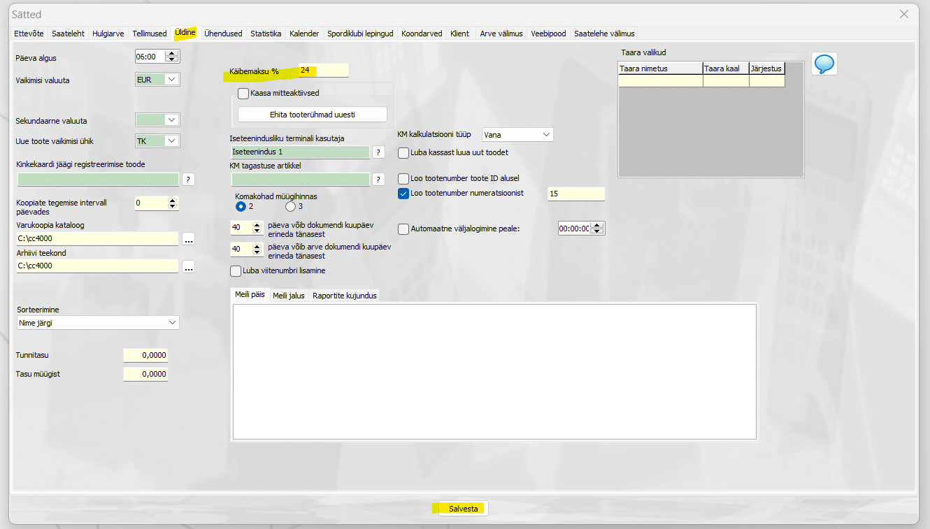 Avanenud aknas saab “Üldine” vahelehel Käibemaksu % muuta. Peale muudatust tuleb vorm “Salvestada”