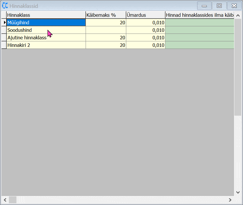 Uut hinnakirja saab luua minnes Müügijuht ja Hinnaklassid. Vajutades klaviatuuril Insert nuppu saab sisestada uue rea, seal tuleb määrata nimi ja Käibemaksu %.