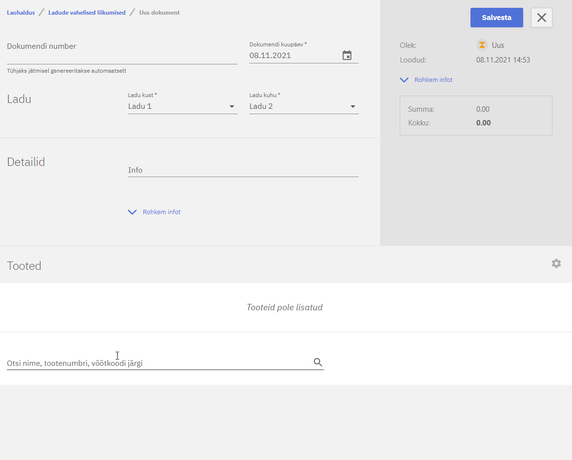 Ettevõtte siseseks kaupade liigutamiseks mõeldud dokument. Ladude vaheliste liikumiste all saab vormistada dokumente kaupade liigutamiseks ühest laost teise (mitme lao olemasolul).