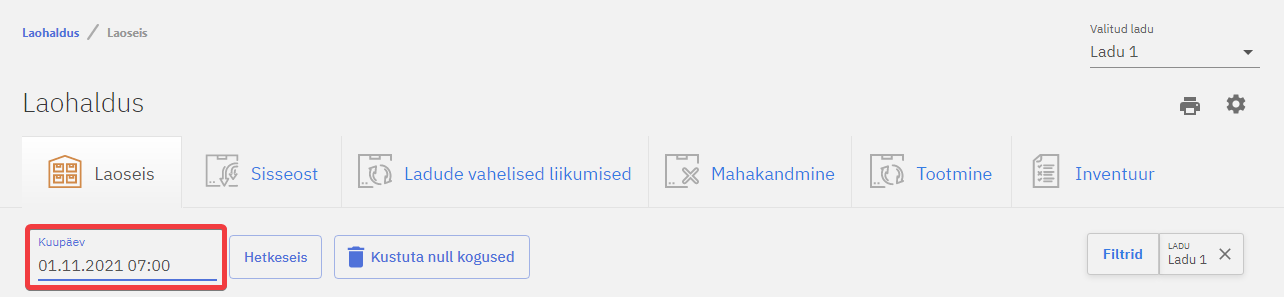 Vajuta Kuupäev lahtrile ning vali avanevast aknast soovitud laoseisu kuupäev ja kellaaeg ning vajuta OK. Programm kuvab laoseisu valitud ajal. Hilisemad müügid, sissetulekud, väljaminekud ja muud laoliikumised selles ei kajastu.