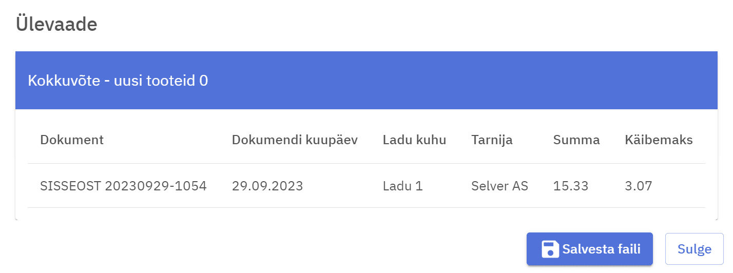 Eduka impordi korral kuvatakse kokkuvõtte aknas loodud saatelehe info. Ostuarve leiab avatud kujul minnes Laohaldus ja Ostuarved. Seal tuleks teha viimane kontroll ja seejärel saateleht Aktsepteerida.