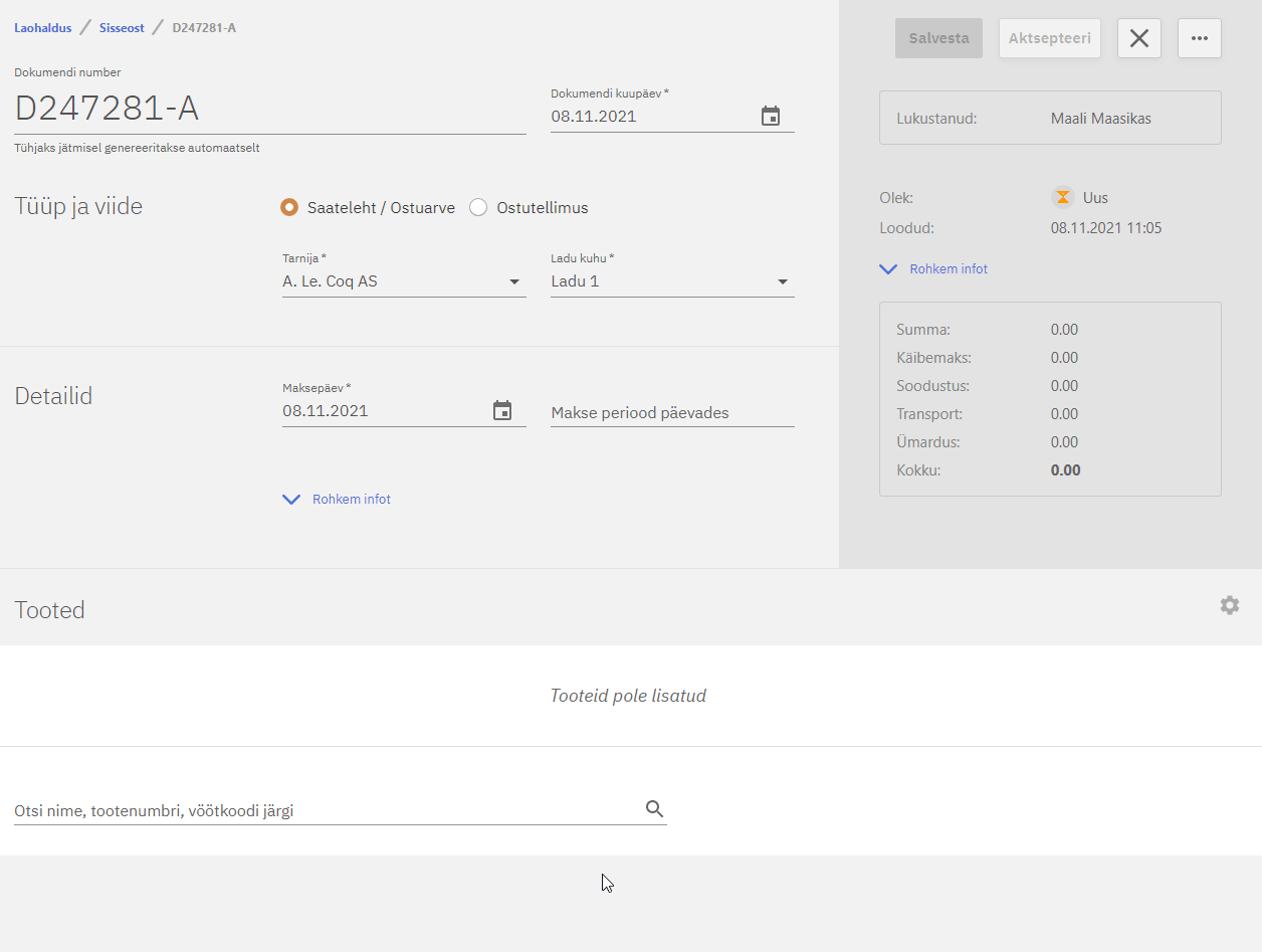 Aktsepteeri nupuga aktsepteerides kinnitatakse dokument, toimub kaupade lattu liikumine ning dokumenti enam muuta ei saa.