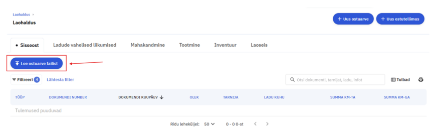 Kui moodul on aktiveeritud saab tarnija saatelehte sisestades Loe ostuarve failist nupu kaudu PDF, JPG või PNG formaadis olevat ostuarvet importida. Nupp on leitav Laohaldus ja Sisseost menüüst