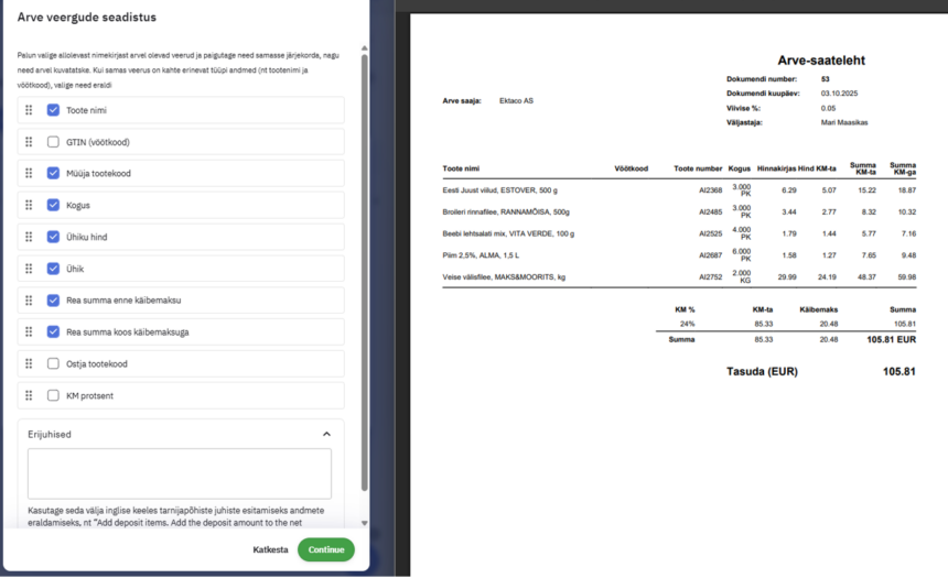 Esimesel korral tarnija arvet sisse võttes peab häälestama arve veergude seadistuse, et programm teaks, millised veerud, millist infot endas sisaldavad.
