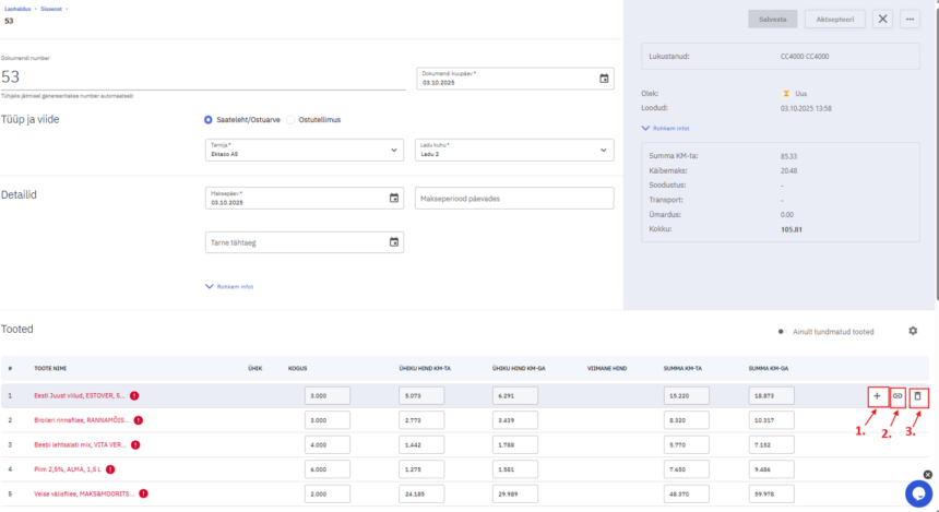 Lisatud real muutub automaatselt aktiivseks Kogus lahter, kuhu saab kohe sisestada ostetud koguse, Enter viib edasi Ühiku hind lahtrisse (ühe ühiku hind KM-ta), Enter viib edasi Summa lahtrisse (rea hind KM-ta ehk kogus * ühiku hind). Ära tuleb täita ainult Ühiku hind või Summa, teine lahter arvutatakse automaatselt vastavalt sisestatud infole.