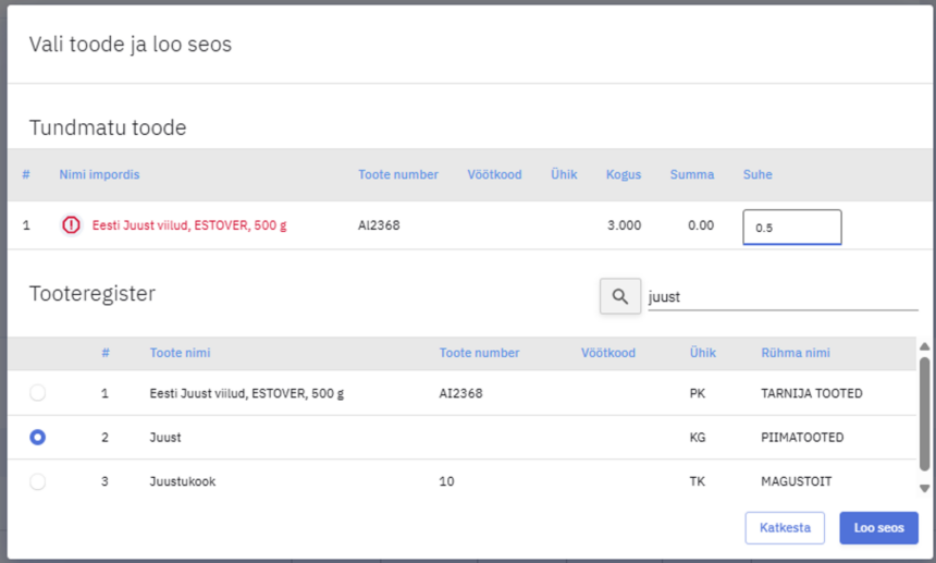 Toodete sidumisel tuleb tooteregistrist üles leida laotoode ning siduda see tarnija tootega. Siin näites on ka määratud suhe 0.5, kuna pakk tarnija juustu on 500 grammi ning laotoode on 1 kilogramm juustu. Suhe annab selle, et kui nüüd võtame tarnijalt sisse 3 pakki juustu, saame endale lattu 1.5 kilogrammi juustu.
