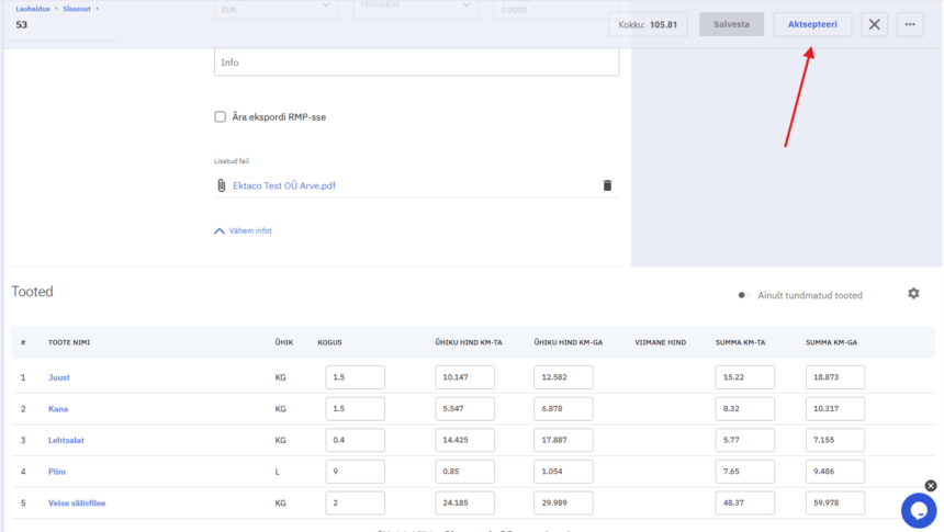Pärast arve ridade sidumist saab ostuarve aktsepteerida ning siis liiguvad tooted lattu.