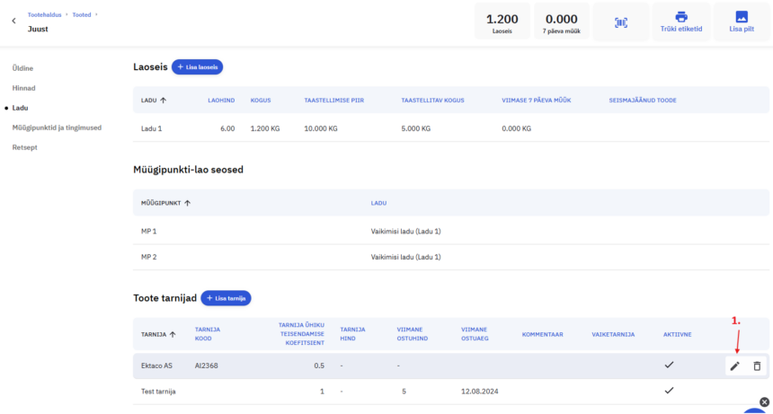 Seos tarnija- ja laotoote vahel luuakse tarnija tootekoodi alusel. Seda seost saab näha ja muuta Tootehaldus > Tooted > Vajutades toote nime peale > Ladu > Toote Tarnijad