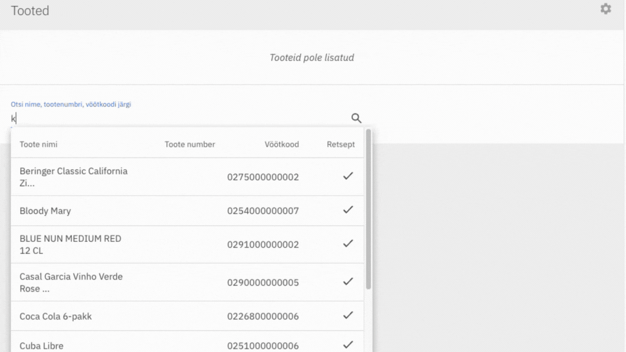 Sisesta retseptid, millest valmistooteid soovid luua. Selleks vajuta lahtris ‘Otsi nime, tootenumbri, vöötkoodi järgi’, otsi vajalik toode (avanenud aknas on võimalik toodete vahel liikuda ka klaviatuuril olevate üles ja alla nooltega) ning tootele klikkides lisa see dokumendile (kasutades toote valimiseks klaviatuuril olevaid nooli on võimalik kasutada ka ENTER klahvi).