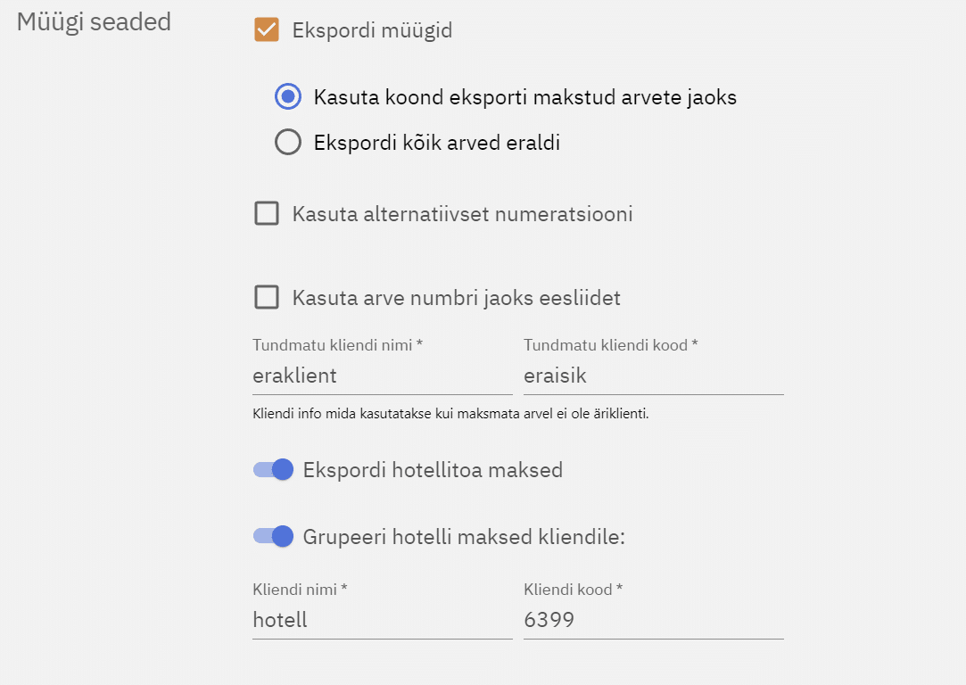 Grupeeri hotelli maksed kliendile koondab kõik Meritis kõik hotelliarved ühe kliendi alla, peab määrama Kliendi nime ja Kliendi koodi