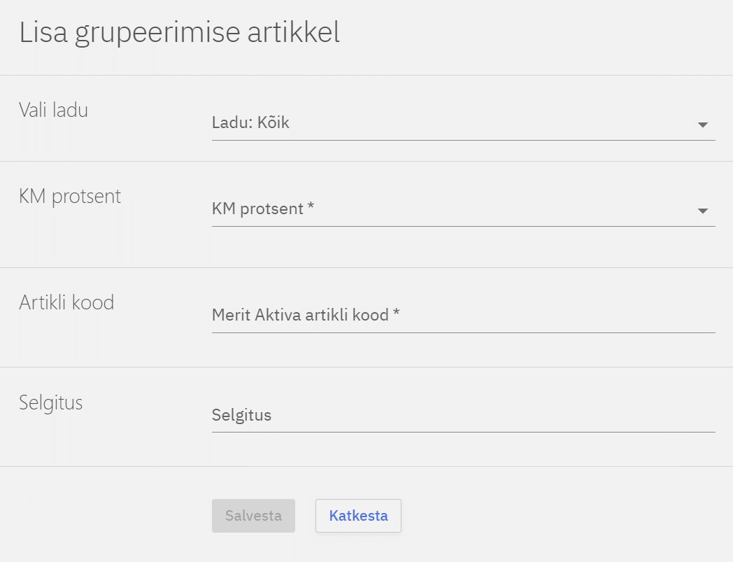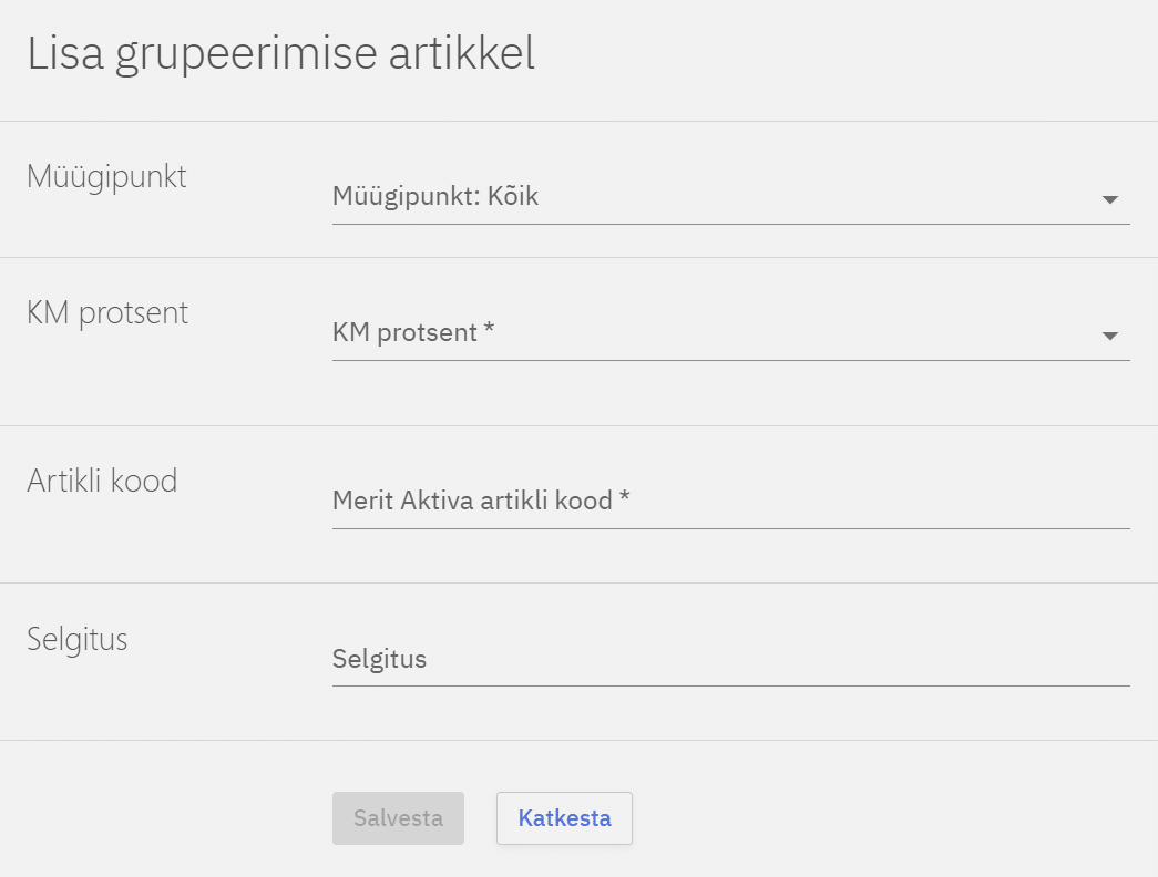 Erinevate KM-dega kaubagruppide artiklid tuleb müügipunktide lõikes siduda Meritis olevate kaupade koodidega. Näiteks kui müüme 20% KM-ga kaupa/teenust sisestame artikli koodi lahtrisse Meritis oleva koodi, näiteks ‘20% kaup’. Siduma peab kõikides müügipunktise kõikide käibemaksudega kaubagruppide artiklid. Siduda saab vajutades nuppu Lisa grupeerimise artikkel. Tuleb valida Compucashi müügipunkt, KM protsent ja vastava protsendiga artikli kood Merit Aktivas.