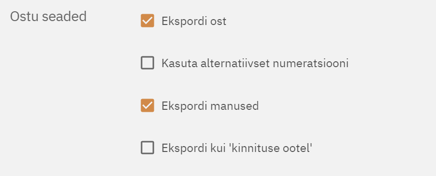 Compucash võimaldab eksportida Meritisse ka ostuarveid, selleks tuleb märkida linnuke Ekspordi ost ja salvestada, seejärel ilmuvad nähtavale ostu seaded.