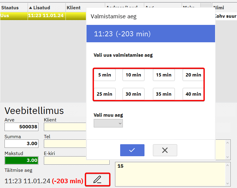3 – Pärast aja sisestamist tuleb tellimus kinnitada, siis saadetakse aeg tagasi Wolti ja prinditakse köögikviitung.