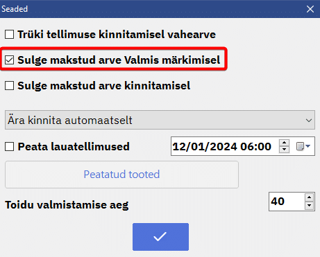 5 – Viimase sammuna tuleb sulgeda Compucashis arve, seda saab teha vajutades Arve nuppu. On soovitatav aktiveerida seadete alt ka konfiguratsioon Sulge makstud arve Valmis märkimisel. Siis suletakse arve automaatselt kui tellimus märgitakse Valmis.