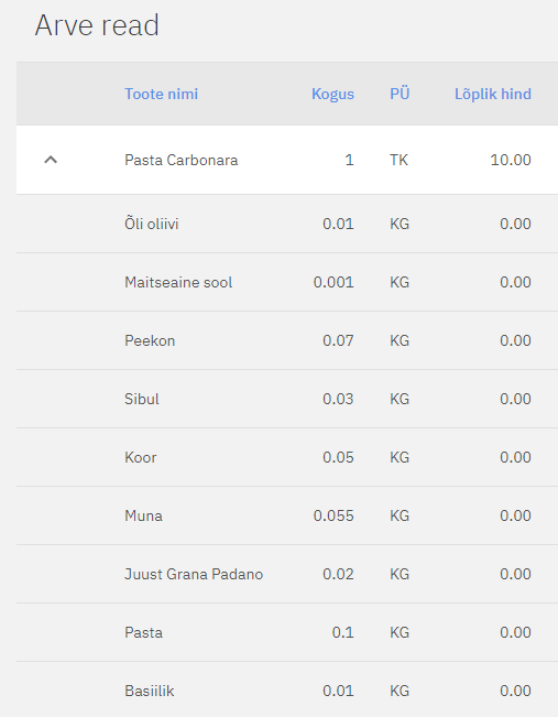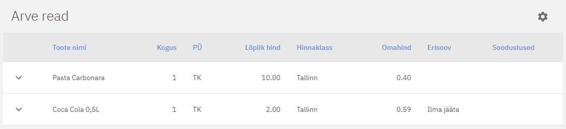 Siin on näha arve read (müügiartiklid), millest arve koosneb.