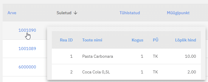 Viies kursori tulbas ’Arve’ olevale arve numbrile, avaneb kiirvaate aken, kus kuvatakse antud arvel oleval tooted ehk arve read.