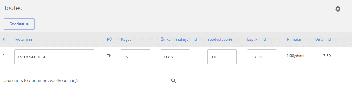Peale kohustuslike väljade täitmist saab “Tooted” lõigus arvele lisada tooted. Toodete lisamiseks otsi toode ning vali see, lisa müüdav kogus, müügihind ning vajadusel soodustuse %. Soodustuse saab lisada ka kõikidele ridadele korraga “Soodustus” nupu abil.