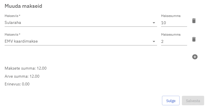 Kui on kogemata registreeritud arve tasumise vale makseviisiga (nt tehti terminaliga kaardimakse aga lõpetati arve sularahamaksega), saab seda korrigeerida vajutades “Muuda makseid” nuppu. Avaneb ’Muuda makseviisi’ aken, kust saab asendada makseviise, muuta makse summasid ning lisada/kustutada makseid. Oluline on, et maksete summa peab klappima arve summaga, vastasel juhul muudatusi salvestada ei saa. Pärast salvestamist muudetakse makseviise ning ka müügiaruannetes toimub muutus.