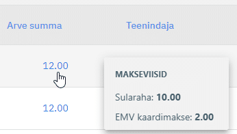 Viies kursori tulbas ’Arve summa’ olevale summale, avaneb kiirvaate aken, kus kuvatakse konkreetse arvega seotud makseviisid.