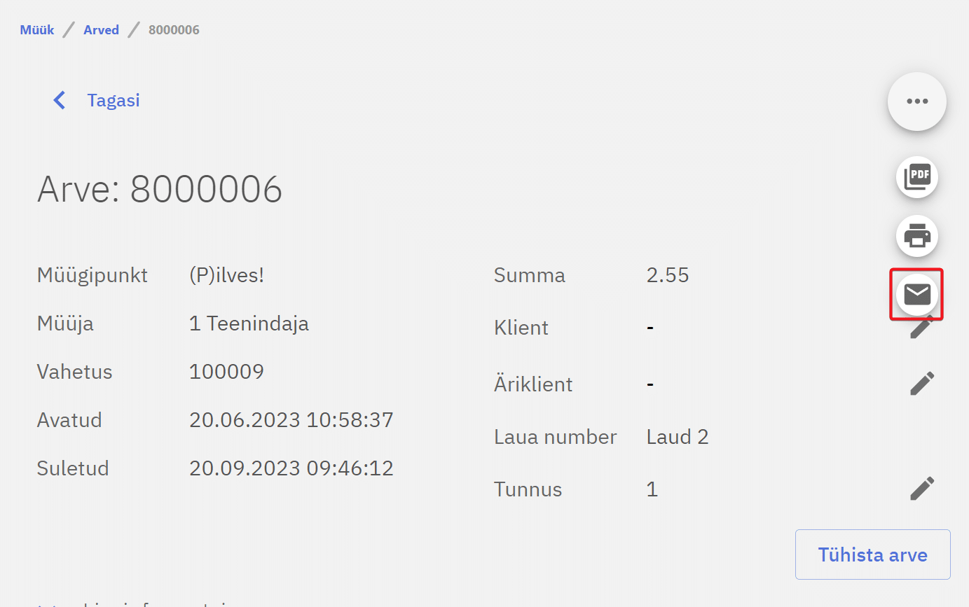 Compucashis saab arve saata kliendile otse meilile minnes paremal nurgas oleva 3 punkti peale. Lisaks PDF-i eksportimisele ja printimisele saab saata arve e-mailiga vajutades vastavat nuppu.