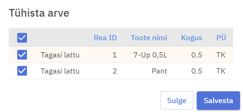 Arve üldinfo all asub nupp Tühista arve, millele vajutades avaneb aken, kust saab valida tooteread, mis arve tühistamisega lattu tagastatakse ja mis mitte.