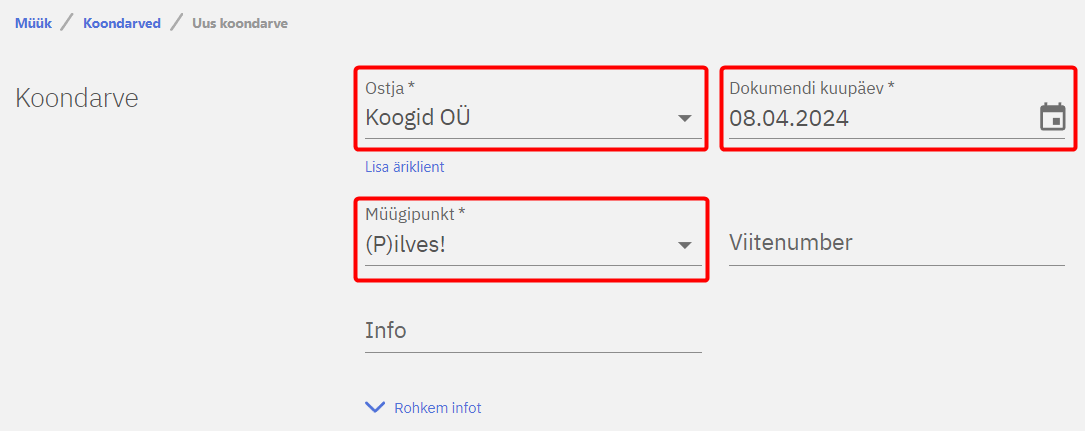 Uut koondarvet saab lisada vajutades nupul Uus koondarve. Seejärel tuleb valida klient (Ostja), Dokumendi kuupäev ja Müügipunkt.