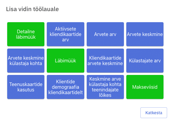 Juhtpaneelile saate luua erinevaid töölaudu, mille kaupa soovid tulemusi vaadata. Näiteks kui teil on mitu kohvikut, siis saate luua ühe töölaua koondtulemuste jälgimiseks ja eraldi töölauad iga kohviku jaoks. Aga võite töölauad jagada ka erineva info jaoks, olgu siis mõõdikute tüüpide kaupa (külastajate info, läbimüügi info, toodete TOP), ajaühikute kaupa (aasta, kuu, päev) või hoopis kasutajate kaupa (Mari, Peeter jne).