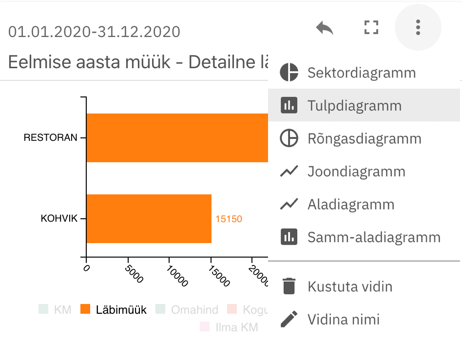 - Vidinale klikates avaneb vaade diagrammina ning vajutades üleval paremal nurgas kolmele täpile saate valida, millise diagrammina soovite infot näha ja samast saate vidinat ka soovi korral kustutada.
