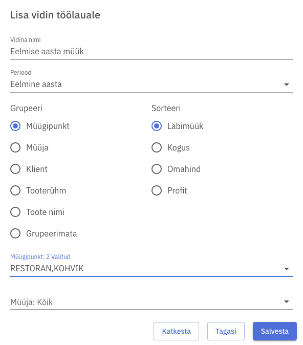 - Müügipunkti ja müüja valikuga saate kitsendada tulemust. Kui te neist midagi ei vali, siis sisaldab number kõiki müügipunkte ja kõiki müüjaid. Kui soovite näha ainult ühe või kahe müügipunkti või ainult osade müüjate infot, siis tehke vastavalt oma kitsendus. Vajutage salvesta ja ongi valmis.