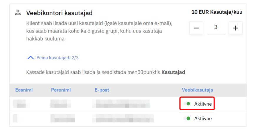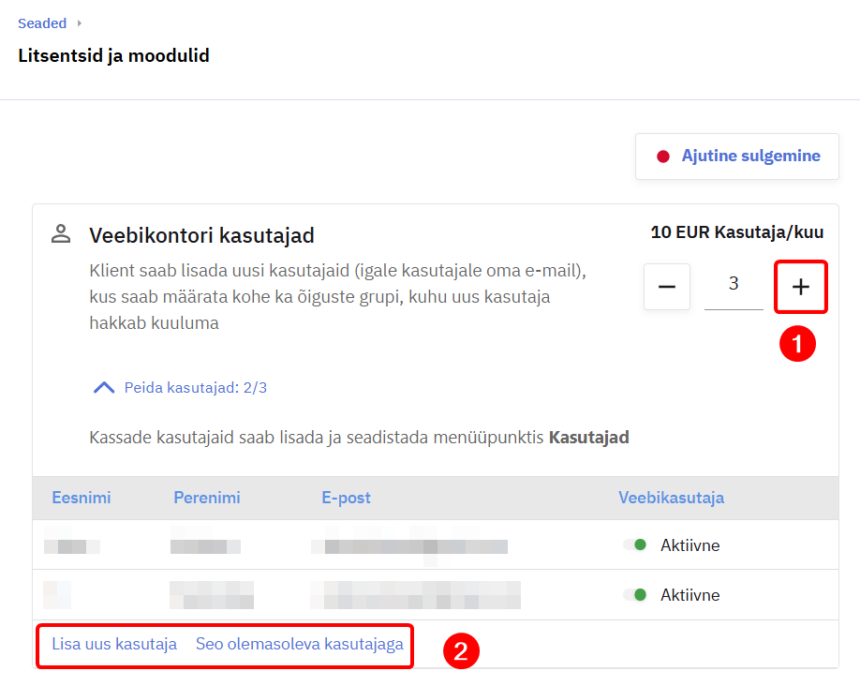 Veebikontori kasutajad on litsentsipõhised, litsentse saab lisada kontorist minnes Seaded ning Litsentsid ja moodulid.