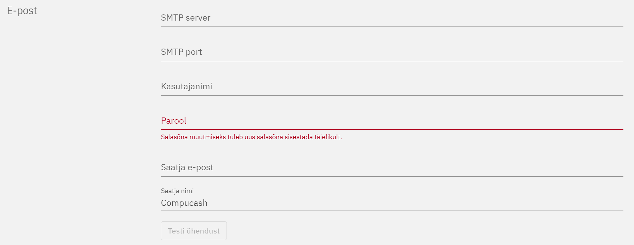 Siin on vaja sisestada SMTP serveri konfiguratsiooni andmed, need andmed saab enamasti e-maili teenuse haldajalt.