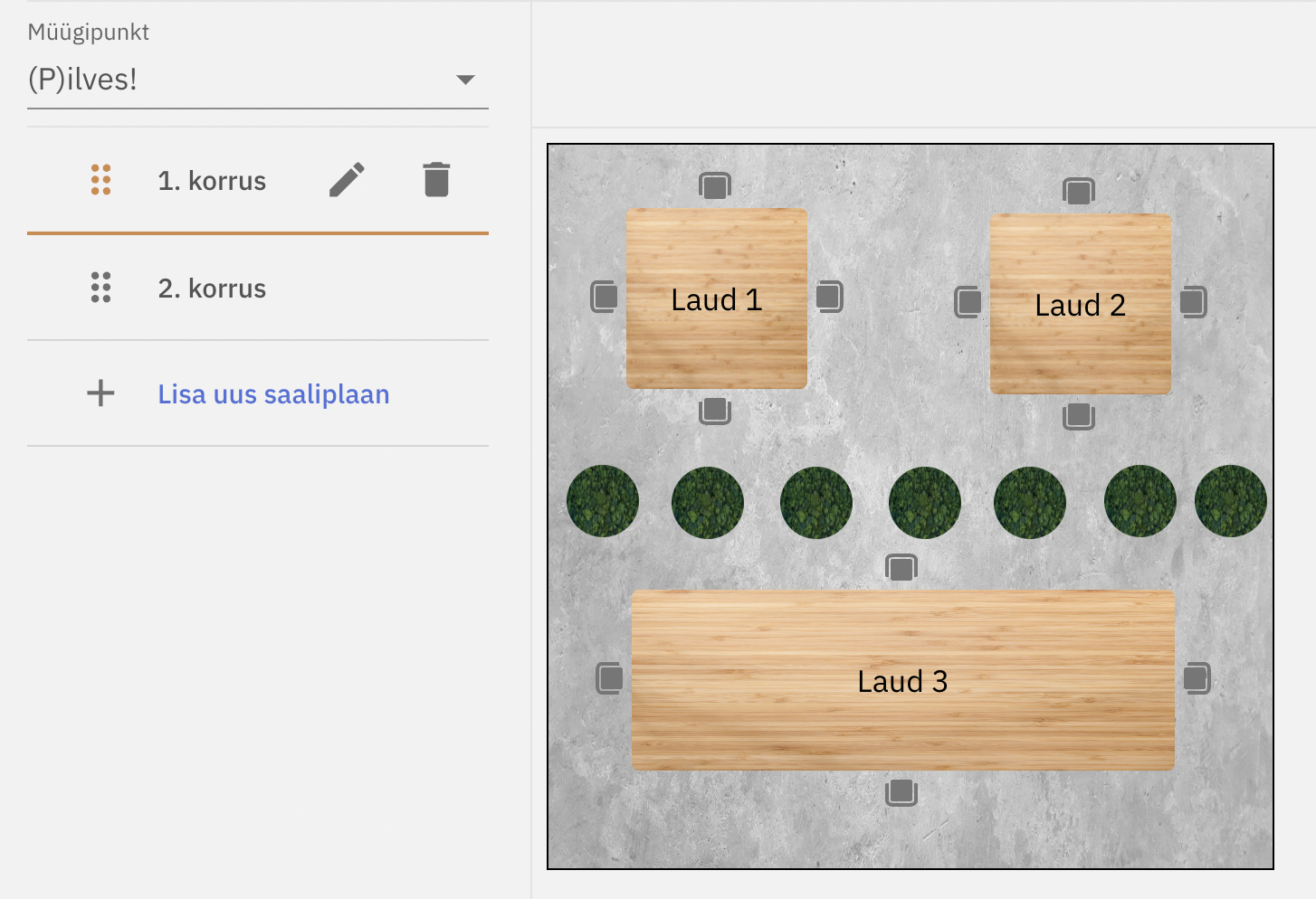 Esmalt tuleb müügipunktide filtrist valida, millisesse müügipunkti saaliplaan luua. Seejärel vajutage ‘Lisa uus saaliplaan’, sisesta plaanile nimi (näiteks 1.korrus), vali mõõdud ning salvesta. Korda protsessi kuni kõik saaliplaanid on lisatud.