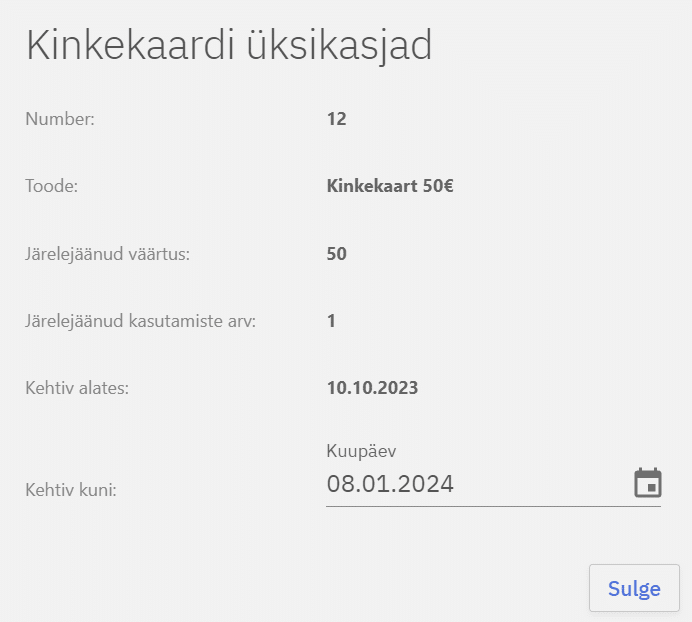 Müüdud kinkekaardil saab muuta kehtivuskuupäeva vajutades kaardi numbri peale. Seal kuvatakse ka detailne info konkreetse kaardi kohta.
