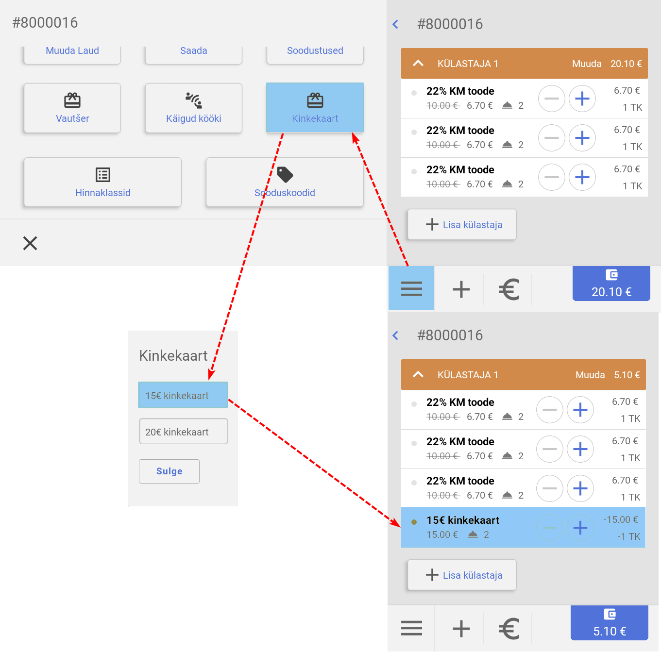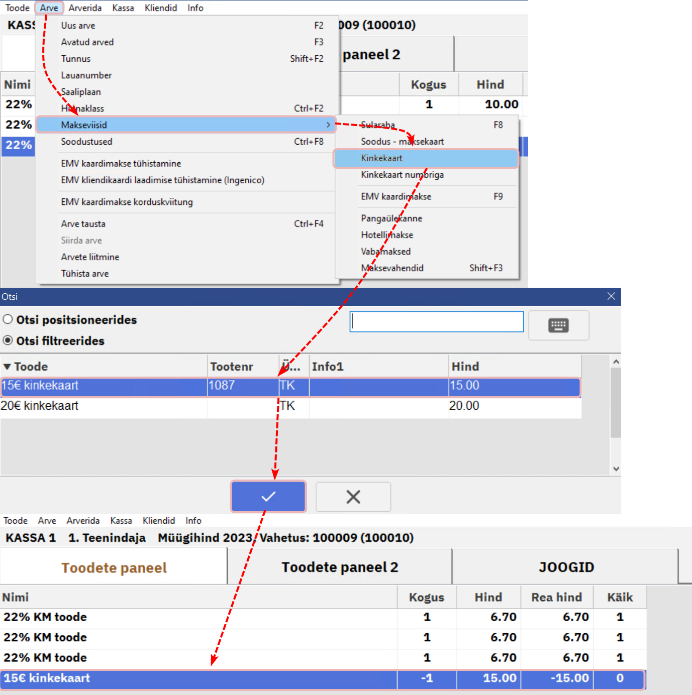 Läbi kassa kinkekaardi müümine läbi kassa käib nagu iga teise toote, vahe on selles, et arve lõpetamisel palub kassa sisestada kinkekaardi koodi või vautseri numbri.