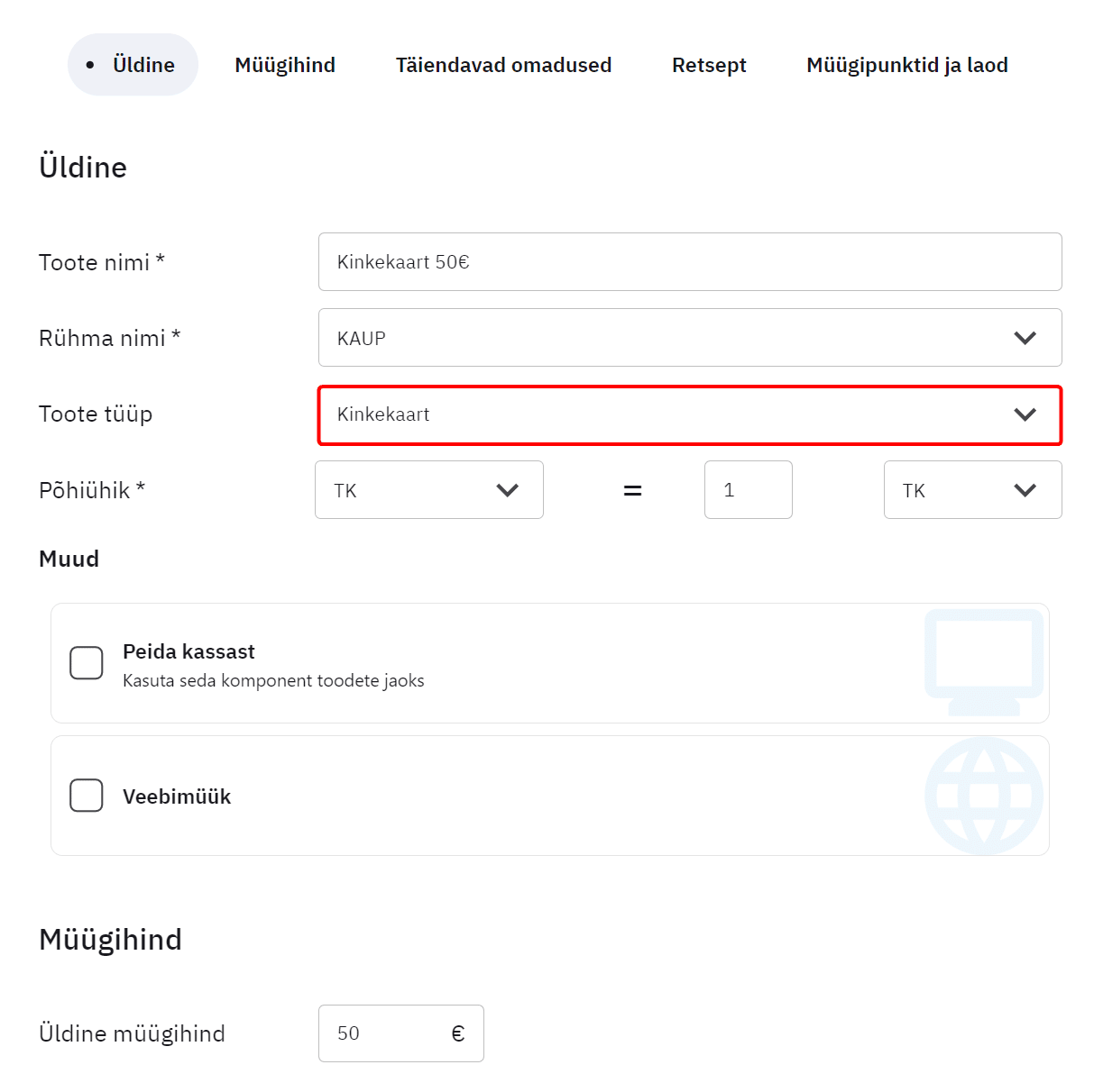 Kinkekaardi toodet saab luua minnes Tootehaldus ja Tooted. Kinkekaardi toote loomine on sarnane tavatoote loomisele, vahe on vaid, et Toote tüüp tuleb valida Kinkekaart.
